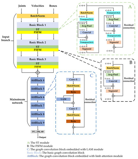 Figure 4 shows the overall structure of the network. It is mainly composed of a multi-input branch module and a mainstream network. The multi-input branch module comprises 3 stacked basic blocks, and the numbers of output channels in each block are 64, 64 and 32, respectively. The mainstream network consists of 6 stacked basic blocks with 128, 128, 128, 256, 256 256 channels, respectively. Figure 2 shows the structural composition of each basic block, with the LAM embedded only in the basic block of the mainstream network. We start by adding a BatchNorm layer to normalize the input data, and end with a fully connected layer to classify action categories. The area bordered by the green dashed line indicates the spatial–temporal attention module, the area bordered by the black dashed line represents the feature selection fusion module and the area bordered by the blue dashed line represents the graph convolution basic block embedded with the limb attention module.