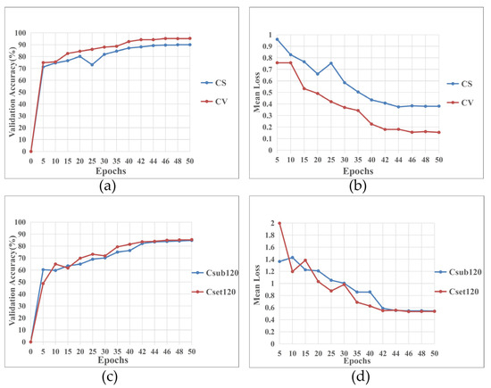 The relationships of validation accuracy and mean loss of CA-EAMGCN vs. the epochs of training on NTU RGB+D 60 and 120 datasets. (a) The relationship between validation accuracy and training epochs on the NTU RGB+D 60 dataset. (b) The relationship between mean loss and training epochs on the NTU RGB+D 60 dataset. (c) The relationship between validation accuracy and training epochs on the NTU RGB+D 120 dataset. (d) The relationship between mean loss and training epochs on the NTU RGB+D 120 dataset.