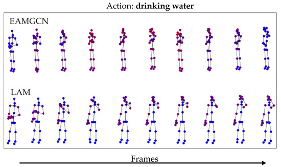 In order to show the workflow of our proposed model, inspired by [13], the joint activation maps of the skeleton sequence are calculated by the technique of class activation maps [41]. As shown in Figure 7, it illustrates the variance of activated joints in several sample frames. From the joint activation maps based on the enhanced adjacency matrix strategy in the top row, we find that the proposed enhanced adjacency matrix strategy can activate joints in the skeleton sequence well and improve the model’s perception ability of global information. Through the joint activation maps of LAM in the bottom row, it can be found that the LAM we proposed can find important joints in action sequences very well.
