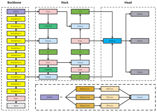 The LPO-YOLOv5 algorithm represents an improvement over YOLOv5. The overall structure of the network is similar, comprising an input, backbone network, neck network, and head network, as depicted in Figure 2. To achieve a lightweight model and reduce the parameter quantity and network complexity, we employ a lightweight MobileNetv3 network in the backbone network for feature extraction. Addressing the issue of imbalanced information distribution between high-level and low-level feature maps, we introduce DSIFM to replace the SPPF module. In the neck network, we utilize the CARAFE module to effectively aggregate contextual information. Furthermore, the DyHead detection head in the head network serves as a plug-and-play module for detecting different perspectives, thereby improving the detection performance of pouring hole positions.