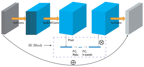 In Figure 3, the module begins by expanding the input features through a 1 × 1 convolution, to enhance the information content of the image. Next, the expanded features undergo a 3 × 3 convolution for depthwise separable convolution, which reduces the parameter computation. The resulting features from the depthwise separable convolution are then passed through the SE attention module. Within this module, the features are globally average pooled and processed by two fully connected layers, automatically assigning weights to the feature maps. This weight allocation amplifies valuable feature channels, while suppressing irrelevant ones. It is worth noting that the activation function for the first fully connected layer is ReLU, while the second fully connected layer employs h-swish. Finally, the reweighted features are dimensionally reduced through a 1 × 1 convolution and added back to the original input feature map, resulting in a new feature map.