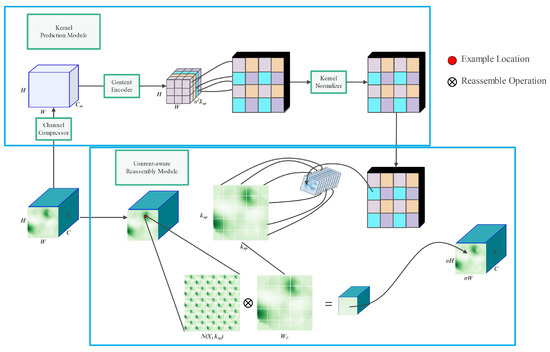 Through the action of each recombined convolutional kernel , the content-aware reassembly module recombines features within local regions using a weighted summation operator. The recombination process for the target position l′ and the corresponding square region N(,) centered at l = (i,j) is shown in Equation (1), where r = ⌊/2⌋.