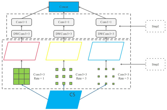 To enrich the contextual feature information and facilitate effective feature extraction, we applied dilated convolution operations to the feature maps that underwent five downsampling operations. We used dilation rates of 1, 3, and 5, as features with both large and small receptive fields, to complement each other. By incorporating different dilation rates, the object detection network can acquire multiple levels of receptive fields. This approach enhances contextual feature information. Moreover, dilated convolution introduces zeros between convolutional kernels, resulting in a relatively smaller number of additional parameters. This aligns with our objective of designing a lightweight network. Then, the feature maps outputted from the dilated convolution module were each subjected to a depthwise separable convolution and finally combined for enhanced network robustness.