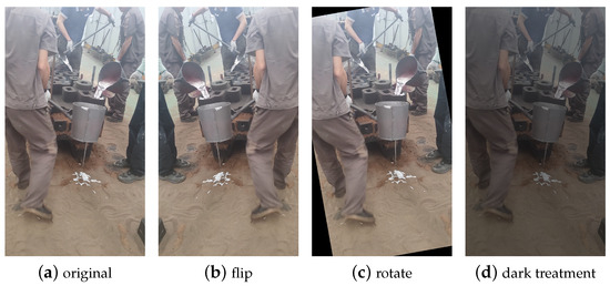 Due to the limited number of researchers studying pour hole detection, a publicly available complete dataset is currently unavailable. Therefore, all the data in this study were captured in the natural working environment of the pouring workshop at Anhui Hengli Additive Manufacturing Technology Co., Ltd., in Wuhu City, Anhui Province, China, using a smartphone. To ensure the quality and effectiveness of the dataset, we aimed to cover different shooting scenarios as comprehensively as possible. During the data collection process, we observed the impact of lighting conditions on image quality. Hence, we made efforts to include various lighting conditions in the collection, encompassing both natural and artificial light. Additionally, we considered the diversity of shooting angles and distances, to ensure sufficient coverage in the dataset. As pouring tasks in the factory may involve unrelated personnel obstructing the pour holes, we also incorporated data with partially obscured pour holes, to enhance the dataset’s robustness. Through a series of data augmentation operations, such as translation and flipping, the final dataset consisted of 2790 images. These images were divided into training, testing, and validation sets in an 8:1:1 ratio. The resolution of the data ranged from 1080 pixels × 1920 pixels to 2080 pixels × 4608 pixels. Sample images from the dataset are shown in Figure 7.