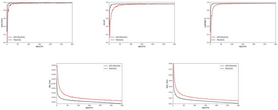 From Figure 8, it is evident that, as the number of model training iterations was increased, both the accuracy, recall rate, and mAP@0.5 value of the original YOLOv5s algorithm and the LPO-YOLOv5s algorithm gradually improved. Although replacing the backbone network resulted in significant fluctuations and a slower convergence speed of the LPO-YOLOv5s algorithm in the first 50 epochs, when the number of training iterations reached 100 epochs, the metrics of both algorithms gradually stabilized and almost converged to the same value. We also found that, compared to the yolov5s algorithm, our method had a higher median value in the model loss curve, but ultimately converged to a relatively small value, which was in line with the experimental expectations.