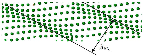 The detected radiation was the sum of the amplitudes, taking into account the phase of the backscattered waves; therefore, we investigated their interference [,]. The phase of the reflecting centers changed when exposed to a certain section of the fiber, which affected the interference of the scattered waves and led to changes in the power received at the receiver. Systems of this type are sensitive to environmental vibrations; for example, the moment of each step of a human walking is a source of acoustic influences. The generated acoustic waves exert pressure on the fiber-optic cable; depending on the parameters of the acoustic impact, the refractive index is modulated. That is, the position of particles in the crystal lattice along the axis of action relative to each other will change with the same frequency as the incoming wave. In the case of a sinusoidal acoustic effect, the change in the grating would look like the following figure (Figure 2).