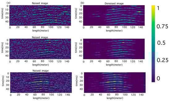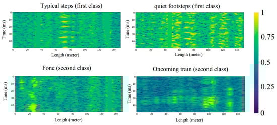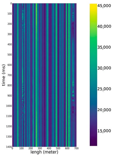 Thus, the received signal traces contain information about the source of the acoustic influences. If the signal traces are recorded at a frequency of 1000 Hz and concatenated according to the recording time, then a space–time diagram is obtained (Figure 3), where the x-axis is the axis of the space, the maximum value of which is equal to the length of the sensor cable; the y-axis is the time axis; and the color (pixel brightness) indicates the intensity of the acoustic impact.