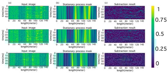 After this, a mask of the stationary component was created (Figure 5b), which was then subtracted from the original image. Furthermore, to reduce the data dimension, elements whose values were less than zero were set to zero (Figure 5c). This operation did not entail the loss of important information.