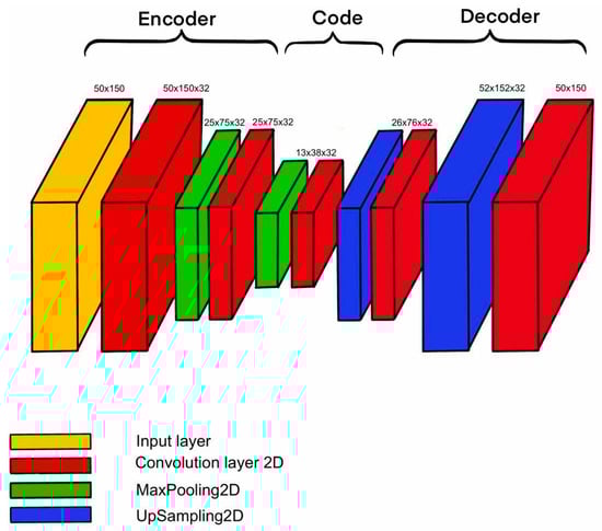 An autoencoder is a type of neural network whose purpose is to copy the features of the input to the output. The autoencoder first encodes the input image into a smaller hidden representation and then decodes it back into an image. The work by Francois Chollet et al. [] described the operation of autoencoders for image processing. This consisted of two parts: the encoder, h = f(x), and the decoder, r = g(h). If the autoencoder is trained to set g(f(x)) = x everywhere, this will not be useful for solving the problem at hand. Therefore, autoencoders are designed in such a way that they cannot learn to copy image data perfectly. Since autoencoder models are forced to prioritize which input data elements to copy, they often extract useful input data. An autoencoder learns to compress the data, minimizing reconstruction errors. Similar studies were carried out by Abdelli K. et al. [,]. In their work, an autoencoder with the most suitable architecture (Figure 6) was trained to solve the problem of noise reduction and artifact removal.