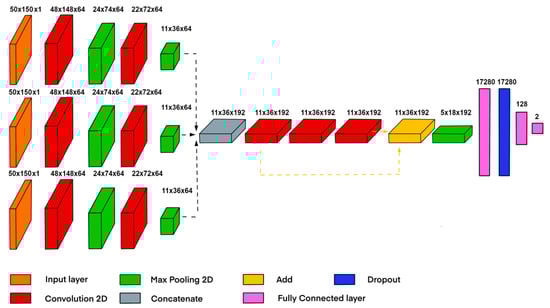 The rectified linear unit (ReLU) function was used as an activation function because of its simplicity, eliminating the need to use more difficult activation functions which could reduce the accuracy of the classifier predictions. The input tensor was divided into 3 channels, in which the unique feature characteristics of each image were extracted. Then, the channels were combined into one tensor, building the convolutional layers. In [], it was mentioned that the desired signals in the images of a space–time diagram have low requirements for invariance and a fairly low spatial hierarchy; therefore, 3 convolutional layers were enough to extract features from them. The use of skip connection technology made it possible to add 2 more layers. This allowed for the extraction of deeper spatial features without losing the accuracy of the classifier. Pooling layers were used in combination with convolution layers (Bieder, F. et al. []) to reduce the size of a tensor. In this paper, we propose the use of max pooling, which samples from 4 neighboring elements since the signal image consists of light stripes on a dark background, making them more perceptible. After passing through the max-pooling layer, the number of data is decreased by a factor of four, considerably reducing the computational cost of training without sacrificing crucial information.