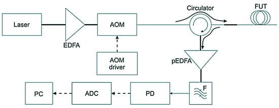 φ-OTDR is a device capable of detecting acoustic effects on a cable on the basis of Rayleigh backscatter analysis (Stepanov, K.V. et al. []). The scheme of the device is shown in Figure 10. The light source used here was a frequency-stabilized laser with a narrow spectral linewidth, the coherence length of which was much greater than the pulse half-width (τ_pulse ~10–500 ns). This caused interference in the backscattered radiation at each pulse position. The continuous laser beam was amplified by an erbium-doped fiber amplifier (EDFA). After the acousto-optic modulator (AOM) modulated the radiation into probing pulses, it entered the sensor fiber through a circulator in the forward path. The backscattered radiation traveled in the circulator in the opposite direction. It was then amplified by the EDFA. Enhanced spontaneous emission (ASE) was eliminated after passing through a narrowband filter. Next, the radiation entered a photodiode (PD) and was digitized with an analog-to-digital converter (ADC) before being processed on a personal computer (PC).