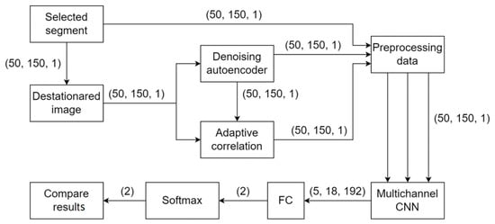 To find a larger number and better quality of features, architecture was created that allowed for the extraction of the most suitable features from each channel of the input tensor (Figure 9). The first channel contained the selected raw segment data; the second contained the segment processed by the autoencoder; and the third contained the results of the adaptive correlation.