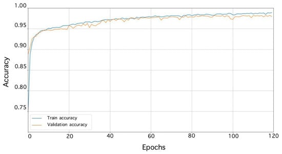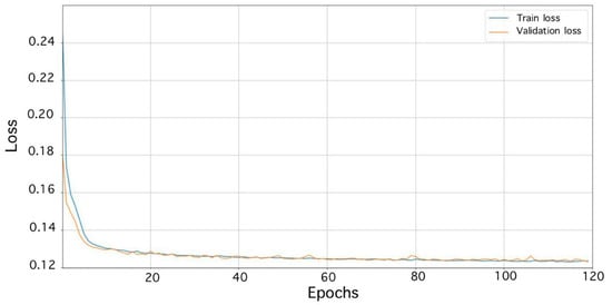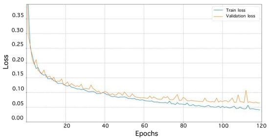On the basis of a priori information about the events, the data for training the classifier were extracted to create a dataset and saved. Then, augmentation was carried out on the existing dataset. For the experiment, 5000 false and 5000 step signal data were obtained. The sets of training and validation data were divided in a ratio of 3:1 (Vrigazova, B. et al. []), respectively. The number of test data is 2800 (1400 false and 1400 steps signal data). The optimal number of epochs was 120. When training the multichannel classifier, loss curves were obtained (Figure 14).