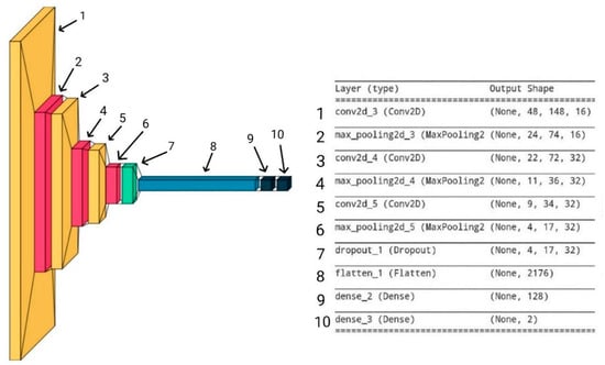 Then, the data were flattened into a vector, and the dropout operation [] was performed, the purpose of which was to reduce overfitting and reduce the probability of falling into a local minimum during training. After that, the vector entered the fully connected layers (FC), the purpose of which was to find hidden features. The two outputs of the last fully connected layer provided data to the softmax activation function, which then returned probabilistic class membership values in the range [0, 1].