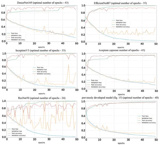 Models based on popular architectures such as DenseNet169 (Figure 16a), EfficientNetB7 (Figure 16b), InceptionV3 (Figure 16c), Xception (Figure 16d), ResNet50 (Figure 16e), and a previously developed architecture (Figure 17) were trained on the original dataset. This makes it possible to compare the obtained results of the algorithm proposed in the manuscript and popular architectures. Hyperparameters and additional layers to the basic architectures were selected experimentally in such a way as to achieve the highest prediction accuracy.