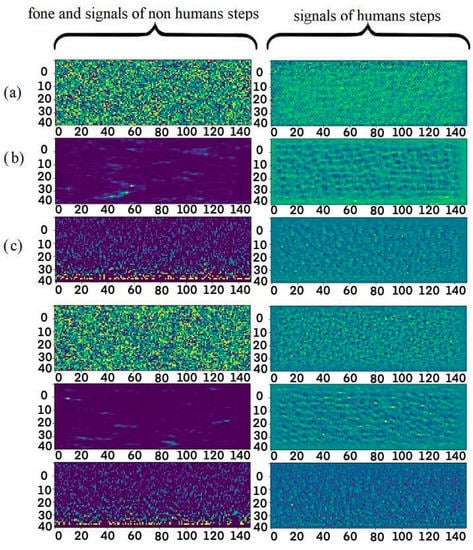 Considering the human factor, an operator may gain confidence in the predictions of security system algorithms. Since classification algorithms may not provide accurate predictions, intrusions may be missed. Therefore, there is a need to refine and create new algorithms for recognizing sources of acoustic influences to reduce the likelihood of false alarms and the omission of signals related to penetration actions. One such algorithm is described in the work by I. A. Barantsov et al. [], in which the researchers created a neural network classifier architecture using a CNN to automatically extract features from segments of a space–time diagram, registering acoustic fields. The desired signals were images of acoustic influences generated during a human step. The disadvantages of this algorithm included the proposed architecture of the neural network not being able to completely select all the necessary spatial features since noise and artifacts that were not related to the signal could interfere with its recognition. Increasing the depth of the neural network would not increase the recognition efficiency, given the low spatial hierarchy and low requirements for the invariance of the signal images. Moreover, a desirable feature of a perimeter detection system is an increased sensitivity in detecting and classifying weak impacts (e.g., quiet footsteps). With a quiet step, the recorded signals have low energy, which worsens their recognition. Thus, this work is aimed at creating an algorithm that allows for the classification of acoustic effects with different energies generated during human steps with high accuracy. Various feature extraction algorithms have a number of advantages and disadvantages. Therefore, multichannel image processing [,], which takes one image as input, processes it with several different feature extraction algorithms, and returns several processed images, is an effective solution for feature extraction. The creation of neural network classifier architecture that has several inputs for processed images in order to extract spatial features from each image independently of others is also an important point for achieving high-accuracy predictions.