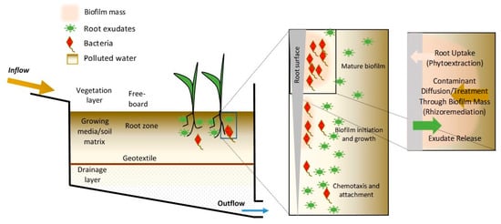 The process of bioremediation in bioretention cells that uses specific types of plants for contaminant removal is called phytoremediation. This can be further classified into where the removal is conducted—either through, or at the roots, or further up the plant matrix. Scientists have identified more than 400 plant species with the potential for direct soil and water bioremediation []. However, not just the plants themselves, but also the microbial communities that exist in the vicinity of the roots —known as rhizospheric bacteria or rhizobacteria—are effective in removing pollutants. Plant roots release exudates that are nutrient-rich and play a crucial role in healthy biofilm growth [,] (see Figure 1). This bioremediation process using the plant-root-associated bacteria is called rhizoremediation and is an indirect bioremediation that is executed by the microbial processes in the rhizosphere. It is thought that when bacterial cells form a community, they become much more effective in bioremediation [].