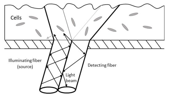 Fiber-optics are an optical-based sensor in which the differences in the turbidity, light scattering, light absorption, reflectance, refractive index, fluorescence, bioluminescence, and surface resonance resulting from the corresponding interaction between the biofilm and the light source, are sensed by the fiber-optic [,] (see Figure 3). Turbidity and surface sensitivity induced by the biofilms are the two measurands that are most commonly measured by optical sensors for biofilm monitoring. Surface-sensitive sensors are developed to improve the signal-to-noise ratio or biofilm-sensing efficiency and monolayers of biofilm by the means of evanescent field sensors []. About two decades ago, researchers proposed a fiber-optic sensor (FOS) that was capable of monitoring the deposition of substances on the tip of the fiber []. The need for biofouling-prevention sensors motivated researchers to craft an FOS for monitoring the biofilm in the groundwater piping system feeding into a brewery []. The sensor, which had a quartz polymer optical fiber head of 0.2 mm in diameter, successfully tracked biofilm growth after reaching 105 cells/cm2 up to 1010 cells/cm2. Fischer et al. [] designed an optical fiber sensor that is suited for use in natural aquatic environments. The device works based on the intrinsic fluorescence properties of the biofilm protein. The working basis of this device is to first back-illuminate the biofilm that forms on a transparent substrate using an ultraviolet–light-emitting diode (UV-LED) and then collect fluorescence by employing numerous optical fiber sensors. The intrinsic fluorescence of the amino acid tryptophan is excited at a specific wavelength and is detected at a different wavelength by using a numerically optimized sensor head that has a UV-LED light source and optical fiber bundles that collect fluorescence light. This system was proposed to be used in the Baltic Sea to monitor biofilm over a period of twenty-one days. Modeling and simulation of the system was performed prior to the experimentations in order to have the optimized design []. The researchers reported a detection limit of 4 × 103 cells/cm2.
