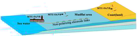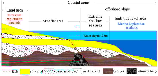 The electric properties of subterranean strata in mudflat regions, encompassing both non-water bearing and water-bearing strata with varying mineralization degrees, present considerable variations, thus providing a fundamental prerequisite for conducting electromagnetic investigations in these zones. The merits of electromagnetic methodologies in the coastal domain, such as their capacity for deeper exploration, high discernibility of low-resistivity layers, and economic efficiency, make them suitable for detecting more profound geological data in regions with extensive sedimentary coverage. Nevertheless, owing to the unique topographical attributes of mudflat areas, electromagnetic explorations in the coastal regions have predominantly been restricted to employing land-based electromagnetic equipment and collection methods in reclaimed zones adjacent to mudflats, with a principal focus on sea intrusions, prehistoric river channels, and geothermal resources. By assessing the existing work and its outcomes, it becomes evident that there are negligible differences in the equipment, implementation, and interpretation techniques between terrestrial electromagnetic surveys conducted in reclaimed regions and traditional land-based electromagnetic surveys. Consequently, these methodologies are deemed inappropriate for utilization in mudflat regions [11,12,13]. In the initial phases, mudflat zones were primarily employed for marine reclamation and aquaculture, with no significant requirement for extensive engineering construction, which, in turn, has constrained the advancement of geotechnical investigation methodologies and techniques pertinent to shallow mudflats. As illustrated in Figure 1, conventional terrestrial electromagnetic exploration methodologies are implemented in terrestrial regions, and marine electromagnetic exploration techniques are utilized in seawater areas with depths exceeding 3 m. However, in the intertidal zone, these traditional terrestrial and marine exploration methodologies prove ineffective in conducting efficacious operations. Aspects such as amphibious work platforms, transmitter layouts, waterproof and corrosion-resistant equipment, efficient data collection methods, and interpretation techniques specifically tailored for electromagnetic exploration in mudflat regions remain largely uncharted territory.