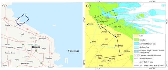 This study endeavors to tackle the challenges inherent in electromagnetic exploration within mudflat regions. To begin with, we refined conventional electromagnetic equipment to surmount the restrictions imposed by existing methodologies. Subsequently, we carried out experimental procedures on a highly efficient data collection technique, reliant on a water–land amphibious platform employing a towed system. This system facilitated the acquisition of various electromagnetic datasets apt for mudflat regions, such as controlled-source audio-frequency magnetotellurics (CSAMT), audio-frequency magnetotellurics (AMT), and magnetotellurics (MT). Utilizing two-dimensional inversion processing, we extracted the subterranean electrical properties of the mudflat area based on multiple electromagnetic profiles acquired east of Xiaoyangkou (Figure 2a), Nantong, in Jiangsu Province. We amalgamated the inversion outcomes with pertinent data, encompassing drilling, hydrogeological, and shallow seismic data, to deduce the distribution of underground structures and fresh and saline water within the study region. The resultant findings are expected to supply foundational geological data to facilitate major engineering construction and freshwater resource development in the area. The positions of the electromagnetic profile layout, the CSAMT transmission source, and the collection points for the drilling data are depicted in Figure 2b.