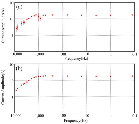 Comparison of CSAMT emission source currents for different grounding conditions ((a) grounding conditions not addressed, (b) grounding conditions backfill dry soil treatment).