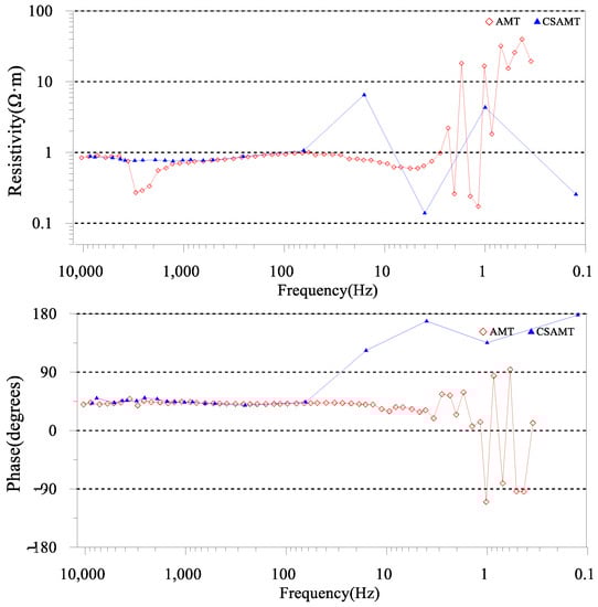 In this study, the electric field Ex and magnetic field Hy data of CSAMT and AMT quadrature collected using a towed mobile receiving system in Rudong, Nantong, Jiangsu, were calculated using Equation (1) to obtain the Cagniard resistivity [23,24].