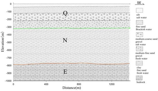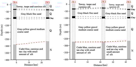 Utilizing borehole data acquired courtesy of the Jiangsu Yangtze River Geological Survey Institute, we constructed a stratigraphic cross-section (as depicted in Figure 8), correlating to two segments indicated by the black lines within Figure 2b. This borehole cross-section reveals the existence of a roughly 130 m thick layer of coarse sand and gravel in the Quaternary system’s lower section, while the Neogene system’s upper portion is characterized by a clay sand aquitard of approximately 120 m thickness. This suggests that the study area exhibited a consistent sedimentary environment from the late Neogene into the early Quaternary periods, with primary sediment components being fine-grained clay and silt. Throughout the early Quaternary, the region underwent subsidence and swift sediment deposition, with coarse sand and gravel prevailing as the chief particulates, indicative of a sedimentary dynamic principally driven by freshwater fluvial processes. Upon analyzing borehole and physical data within the study region, it was noted that the resistivity of geological layers demonstrated a strong correlation with porosity, with strata comprising coarse sand, medium-coarse sand, and sandstone demonstrating relatively high resistivity. However, factors such as water and seawater content were not considered; thus, the lithology’s physical characteristics alone cannot serve as the sole basis for interpreting the profile.