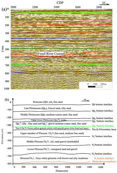 Shallow seismic time profile and stratigraphic layered interpretation profile of L1 line in Xiaoyangkou harbor ((a) Shallow seismic time profile, (b) layered interpretation profile).