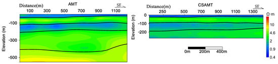 The AMT data presents a stratified arrangement from the superficial to the profound layers, demonstrating a sequence of low resistivity, marginally elevated resistivity, low resistivity, marginally elevated resistivity, and sub-high resistivity. The CSAMT inversion profiles manifest a similar pattern of low resistivity (Figure 10), marginally elevated resistivity, low resistivity, and marginally elevated resistivity, denoting superior resolution in the shallow sections of the CSAMT (Figure 11) [28]. When combined with drilling data, it can be inferred that the stratum spanning from 0 to 20 m correlates with a siltstone layer infiltrated with seawater, characterized by low resistivity (resistivity values ranging from 0.5 to 1.0 Ω·m). The 20–100 m layer corresponds to sandstone and fine sandstone with minor seawater content, exhibiting marginally elevated resistivity (resistivity values falling within 1–10 Ω·m). The 100–200 m layer aligns with coarse sandstone and sandstone presenting high porosity and mineralization, characterized by low resistivity (resistivity values from 0.5 to 1.5 Ω·m). The stratum spanning from 200 to 420 m matches with shale exhibiting low porosity and mineralization, characterized by high resistivity (resistivity values ranging from 2 to 8 Ω·m). Subsequently, layers situated below 420 m correspond to gravel and coarse sandstone layers with minimal water content, thus showing high resistivity (resistivity values ranging from 8 to 100 Ω·m) [29,30,31,32].