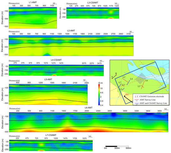 The groundwater within the study area predominantly resides in the Neogene and Quaternary unconsolidated sedimentary sand layers, boasting an overall thickness exceeding 500 m and maximum depths within the 750–1000 m range. The electrical attributes of the formations are primarily dictated by the development level of the water-bearing sand layer or ancient river channel, and the salinity of the groundwater. Freshwater sand layers present relatively high resistivity, whereas those of saline water sand layers display low resistivity. The thickness of the saline water layer within the Quaternary formations surpasses 300 m, showcasing an exceptionally low resistivity of just a few ohm-meters. Based on the evaluation of existing drilling data from the vicinity of the study area, the Quaternary formations and their electrical characteristics align with the regional geology. The aquifers are primarily constituted of fine sand or silt layers exhibiting high resistivity, and the resistivity difference between the aquifers and the encompassing clay layers is approximately 10–20 Ω·m, with the depth of the aquifers exceeding that reflected in the regional data [18].