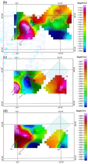 Due to the uneven distribution of the survey lines in the plane, Figure 13 only qualitatively analyzes the plane distribution characteristics of each aquifer within a certain range (part of the depth references the shallow seismic results of lines L1, L4, and L5 on the same profile).