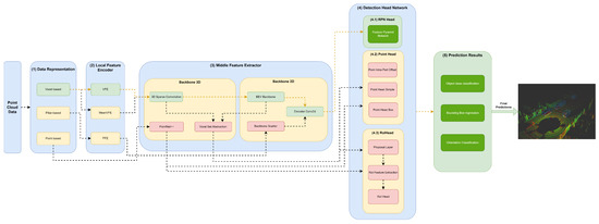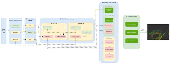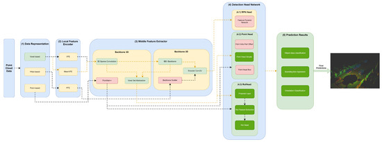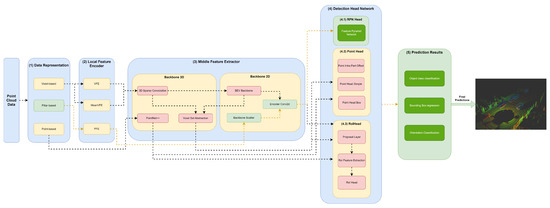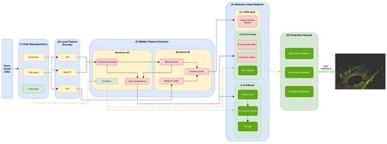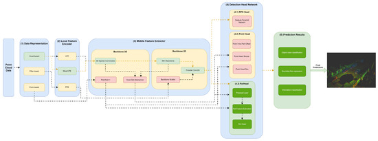 The (3) middle feature extractor is responsible for extracting more features from the (2) local feature encoders to provide more context for the shape description of objects for the networks of the detection head module. Various methods are used; herein, we separated them into 3D backbones and 2D backbones, which will be described in more detail below.