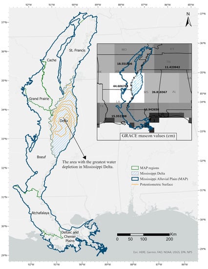 Since mascon is reporting the water level changes for each month, and the results (Figure 3) is showing smaller mascon values in the central toward the south of the Delta region, we can say that there is less water mass above the baseline. This result aligns with the report from [] which said that the largest depression in the potentiometric surface has happened in the central part of the Delta region. This area is crucial in agricultural production in Mississippi []. Ref. [] has reported the association between groundwater withdrawals and streamflow depletion in the Sunflower River as well.