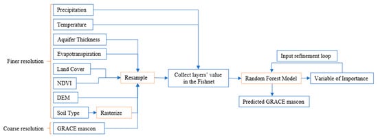 We obtained eight different data layers as inputs and a mascon layer with an original resolution to use in the RFM. The data type and their spatial resolution are listed in Table 1 and a brief description about each layer is provided below. we made an effort to obtain all data to align with the month of the GRACE mascon data which is April 2020. The approach for downscaling is shown in Figure 2.
