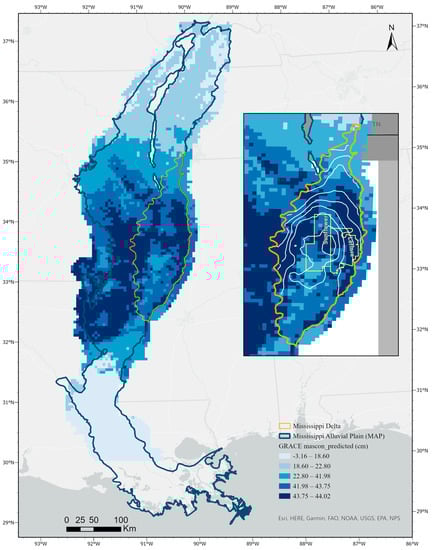 Figure 3, the predicted GRACE mascon of the MAP region, shows that the low water level can be seen in the southeast of Arkansas, central parts of Delta in Mississippi, and northeast of Louisiana, in the MAP region. According to [], there was a significant decline in groundwater levels from 2004–2014 in the Boeuf-Tensas basin. According to National Land Cover Database (NLCD) 2021, more than 50% of the MAP and the Mississippi Delta regions are cultivated. In both regions, the dominant crop types are soybean, cotton, corn, and rice. The greatest volume of water for irrigation is being used for rice, corn, soybean, and cotton, respectively. Based on Louisiana parish reports [,,], in most of the parishes, the groundwater withdrawal for irrigating rice and other crops has increased over time.
