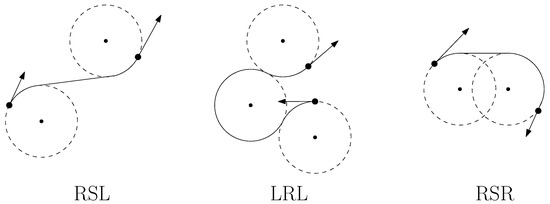 where u is the input to the vehicle and is the minimum turning radius of the vehicle. Dubins proposed that in an obstacle-free environment, the shortest path between any two configurations on a 2D plane for a Dubins vehicle must be either the type or the type or a combination of sub-paths of these two types; here, C represents an arc of a circle with a radius of , and S represents a straight line segment. These paths can be expressed as , , , , , or , where L and R indicate clockwise and counterclockwise turns of a C segment, respectively, as illustrated in Figure 1. When the vehicle is also capable of reversing, the shortest path problem was solved by Reeds and Shepp in [19]. Optimal solutions to these problems were also derived by Sussmann and Tang (1991) [20] as well as Boissonnat et al. (1994) [21], utilizing the Pontryagin maximum principle [22]. Tang and Özgüner (2005) [23] and Rathinam et al. (2007) [24] have further expanded upon Dubins’ research by applying it to routing problems involving car-like mobile robots or fixed-wing aerial vehicles that maintain a constant forward speed and adhere to curvature constraints while making turns.