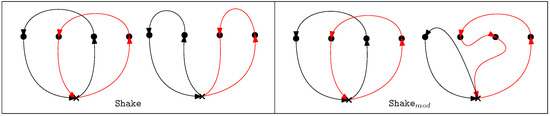 ‘Shaking’ is the randomization part of the BVNS heuristic. Shaking perturbs the initial solution while ensuring that the new neighborhood still retains certain aspects of the initial incumbent. In this step, a random feasible solution in the current neighborhood of x is found. This random selection enables the algorithm to avoid stopping at the local optima in the local search procedure. In this work, we investigate two different Shake neighborhoods: Shake and Shake. Shake refers to picking two random targets , from tours of two random vehicles v and , respectively, and swapping the targets between tours. The position of insertion for the targets is also selected at random. For the MD-GmTSP, in addition to Shake, a modified shake Shake is also evaluated. In Shake, a random target is selected from a random tour , and is transferred to another tour chosen at random. The insertion of the targets into the tours can be random or greedy (position leading to a minimal increase in tour length). The different shake neighborhoods are illustrated in Figure 3.