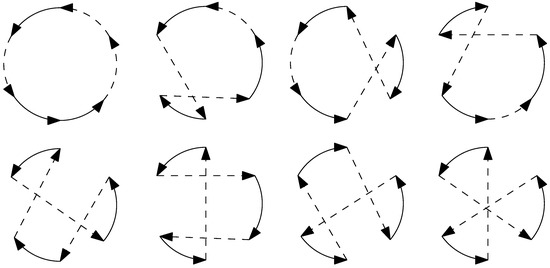 The 3-opt algorithm [75] works similarly to the 2-opt but by reconnecting three edges instead of two, as seen in Figure 5. There are seven different ways of reconnecting the edges. Each new tour formed by reconnecting the edges is analyzed to find the optimum one. This process repeats until all possible three-edge combinations in the network are checked for improvement. A 3-optimal tour is also a 2-optimal one. A 3-opt exchange yields better solutions, but it is much slower ( complexity) compared to the 2-opt ( complexity).
