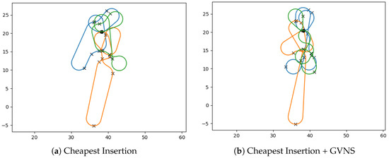To obtain a globally optimal solution for a problem expressed as an MILP, it is common to use solvers such as Gurobi or CPLEX. Although these solvers are effective in solving smaller instances of the Euclidean mTSP (for example, an instance with 100 nodes and 3–5 robots takes up to 3 h to solve using a MILP formulation [72]), they struggle to scale to larger instances that involve multiple robots, especially for difficult problems such as the MD-GmTSP. In the following section, we introduce a variable-neighborhood-search-based heuristic that leverages the problem’s structure to generate fast and high-quality solutions.
