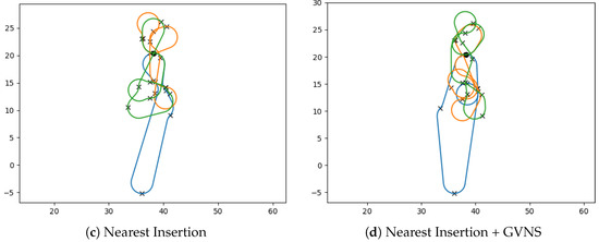 Let I denote a problem instance of the MD-GmTSP. Let X represent the set of feasible solutions for this instance. For any , let denote a function that calculates the objective cost, which, in the case of the MD-GmTSP, corresponds to the Dubins tour length of the largest tour within x. It is important to note that the solution set X is finite but the size of the set can exponentially increase with the size (number of targets) of an instance of MD-GmTSP. Our goal is to find a solution such that . To facilitate this search, we define a neighborhood for each solution , where N is a function that maps from a solution x to a set of solutions in its neighborhood. A solution is defined to be locally optimal or is said to be a local optimum with respect to a neighborhood N if . Improvement heuristics aim to find a locally optimal solution before the termination condition is met. In this paper, we investigate three improvement heuristics based on VNS for solving the MD-GmTSP, namely (1) basic variable neighborhood search (BVNS), (2) variable neighborhood descent (VND), and (3) general variable neighborhood search (GVNS).