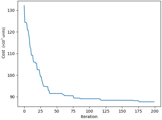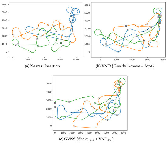The heuristic approach can be divided into two broad phases: (1) construction phase—initial solution and (2) improvement phase—neighborhood search. In the construction phase, a tour construction heuristic is used to generate an initial feasible solution for the given problem. Based on this initial solution, the neighborhood search phase aims to obtain better solutions by making incremental improvements. The tour improvement phase starts by defining a set of neighborhood structures in the solution space. These neighborhood search structures, denoted as , can be chosen either arbitrarily or based on a sequence of neighborhood changes with increasing cardinality. Once the neighborhood search structures are fixed, different neighborhoods are explored in deterministic or stochastic ways, depending on the type of VNS metaheuristic used. If a better solution is found in the -th neighborhood, then the search is re-centered around the new incumbent. Otherwise, the search moves to the next neighborhood, . Depending on the chosen neighborhood structures, different neighborhoods of the solution space are reached. VNS does not follow a predefined trajectory but explores increasingly distant neighborhoods of the current solution. A jump to a new solution is made only if an improvement is achieved, often retaining favorable characteristics of the incumbent solution to obtain promising neighboring solutions.