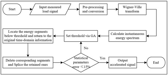 In this study, to develop a new effective time-frequency-domain accelerated editing method, a Wigner-Ville Transform-based (WVT-based) analysis technology is proposed for generating an instantaneous energy spectrum (IES) from the signal. The instantaneous energy of each corresponding time-domain point serves as a discriminant for determining the magnitude of damage contribution from different amplitude loads. To optimize the threshold selection model for the IES, a genetic algorithm is employed. The load spectrum of a vehicle suspension coil spring is measured and used as an example to validate the novel editing method’s effectiveness and superiority in terms of damage equivalency, characteristic parameters, frequency-domain distribution, fatigue simulation test, etc.