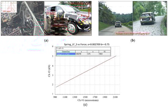 The coil spring signals were tested and collected by employing strain gauges, which were plastered and bridged to establish the relationship between force and bridge circuit output. By fitting the force to the output voltage of the bridge circuit, the calibration coefficient of the spring was obtained. Then, the calibration force under test road conditions could be calculated based on the measured strain data. The test site distribution and test vehicle are shown in Figure 2a, and some of the test scenarios are depicted in Figure 2b. Additionally, the load calibration curve of the left front coil spring signal is shown in Figure 2c.