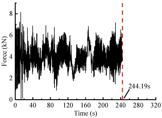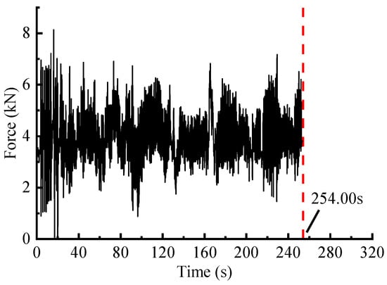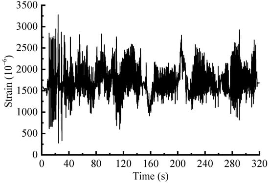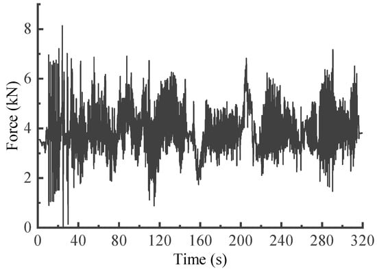 After calibration, the suspension coil springs with strain gauges attached were mounted on the vehicle and subsequently tested. The eDAQ data acquisition system was employed with a sample rate set at 500 Hz. However, the collected signals often encompass extraneous signal components that hinder analysis [1]. Therefore, referring to the processing flow outlined in the literature [22], the measured load signals were sequentially pre-processed with the corresponding signal preprocessing modules in nCode Glyphworks software (HBM nCode v2018). By selecting suitable methods and parameters, the signals underwent pre-processing steps that encompassed 0–50 Hz low-pass filtering, drift correction, deburring and 200 Hz resampling process, and the reasonableness of the processed signals was then checked. Additionally, conspicuous transition sections were removed. The pre-processed signal is shown in Figure 3, with a total time duration of 320 s.