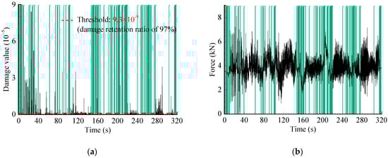 The time-domain editing process is mainly performed in nCode software. This method generally targets strain or stress signals, as the force spectrum cannot be directly edited [6]. According to Section 3.1, the spring strain signal correlates with the force signal, which means that the strain history range is proportional to the force history range, so the measured strain load was utilized as a reference signal for editing (Figure 8). The signal reduction with specified damage retention could be achieved by setting two key parameters: damage retention ratio (97%) and windows’ length (1.5 s). The time-domain damage distribution is shown in Figure 9a. The threshold was then computed automatically according to the set parameters, and the strain-load time segments with small damage contributions were identified in Figure 9b. The time segments at the same position in the original spectrum were removed. The final obtained accelerated signal is shown in Figure 10, with a time duration of 254 s.