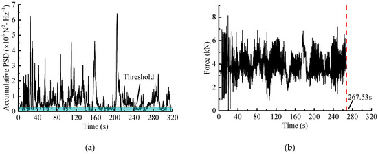 The STFT-based editing process is with reference to [12]. Combined with a ‘spectrogram’ function in MATLAB, the window function is chosen as the Gaussian, with a window length and an overlap . Consequently, the AccPSD (Figure 11a) was calculated, and the acceleration threshold was set according to the pseudo-damage retention ratio, so that the segments with high damage contribution were identified and retained. The retained segments with high AccPSD values were then mapped to the original time-domain to extract corresponding time segments, which were spliced as an accelerated spectrum (Figure 11b).