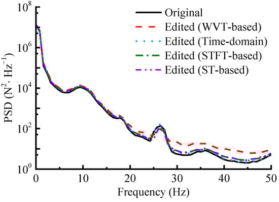 As shown in Figure 13, the PSD distributions and change trends of the accelerated spectrums in the low-frequency part are almost the same as the original, while the removal of small-amplitude loads in the high-frequency band causes the PSD distributions in this region to vary. Notably, the WVT-based edited spectrum, which has a greater compression in time duration, shows a more pronounced upward shift in its PSD distribution curve in the high-frequency band. Nevertheless, this shift is considered acceptable. Meanwhile, the Pearson correlation coefficients between the PSD of the original and that of the accelerated spectrums obtained via WVT-based, time-domain editing, STFT-based and ST-based methods are calculated as 0.990, 0.999, 0.995 and 0.996, respectively. These coefficients exceed 0.99 and approach 1, indicating a very high degree of agreement. These findings demonstrate that the proposed accelerated editing effectively avoids changing frequency-domain characteristics, validating the effectiveness of the WVT-based method.