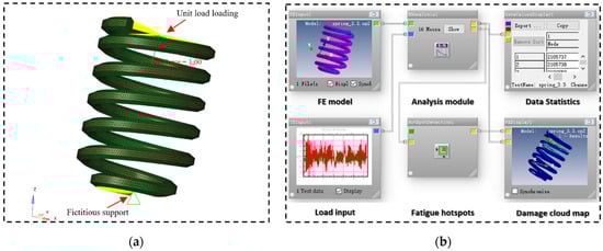 Fatigue simulation analysis: (a) Finite element model; (b) The analysis flow diagram.