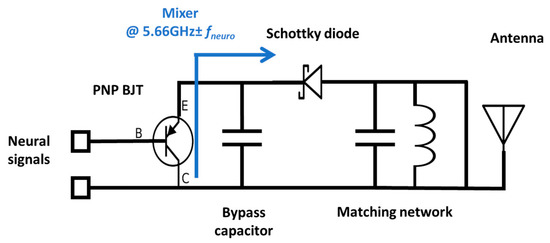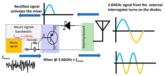 The neural recording system can be divided into two sections: (i) the implant and (ii) the interrogator, as shown in Figure 1. The implanted neurosensor depends on the RF backscattering technique that is widely used in RFID applications. Electrode–tissue impedances are of the order of 10–100 kΩ for practical electrode designs. On the other hand, RF signal chains are designed at 50 Ohms. To deal with high impedance mismatch and DC offset, the backscattering circuit employs a BJT that is biased by an activated diode. The incident signal at F1 GHz (typically at ~2.4 GHz) which comes from the interrogator is used to activate the diode in the forward region. The activated or turned-on diode acts as a rectifier circuit to bias the BJT transistor. In the second cycle of the sinewave, the activated transistor and the RF diode act as RF mixers. Thus, it backscatters the fneuro signals ± 2F1 (at ~4.8 GHz) GHz. Figure 2 illustrates the concept of the RF backscattering of the implanted neurosensor. The designs in this paper were implemented at 2.83 and 5.66 GHz.