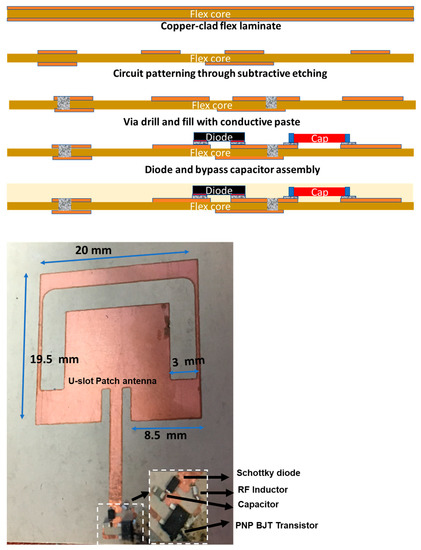 The primary goal is to demonstrate the passive sensor circuit towards implantable applications. Implants need hermetic encasing and feedthroughs with long-term tissue-compatible materials. Hermetic feedthroughs and a biocompatible package are beyond the scope of this paper as only the sensor circuit function is considered in this paper. Rogers RO3010TM laminates were chosen as a substrate, because they have excellent properties at high frequencies, are dimensionally stable, and are effective for circuit miniaturization. Figure 4 illustrates the fabrication process. The sensor traces were obtained by subtractive copper patterning with higher conductivity instead of printed silver traces. To achieve low-cost large-area fabrication, standard dry-film photoresists were used. In order to improve adhesion during copper etching and photoresist patterning, the substrate was cleaned and micro-etched. UV light was used for lithography at a 360 nm narrowband wavelength. Photoresists were developed in a 1% sodium borate solution at 60 °C. Sulfuric acid–peroxide etchant was used to etch copper. The etchant was heated to 60 °C in order to improve the etching rate. The photoresist was removed with acetone to expose the copper traces. On the backside of the substrate, vias were laser drilled and filled with silver paste to interface with the electrodes. Assembly was performed with solders. In order to enhance the electrical and mechanical properties of devices, conductive silver elastomer adhesives were utilized as chip-to-flex interconnection layers. Compared with silver pastes that were loaded with 85 wt.% particles, pastes with 65% of particles were found to exhibit higher mechanical strength and stability during reliability testing in our earlier work and, hence, were used.